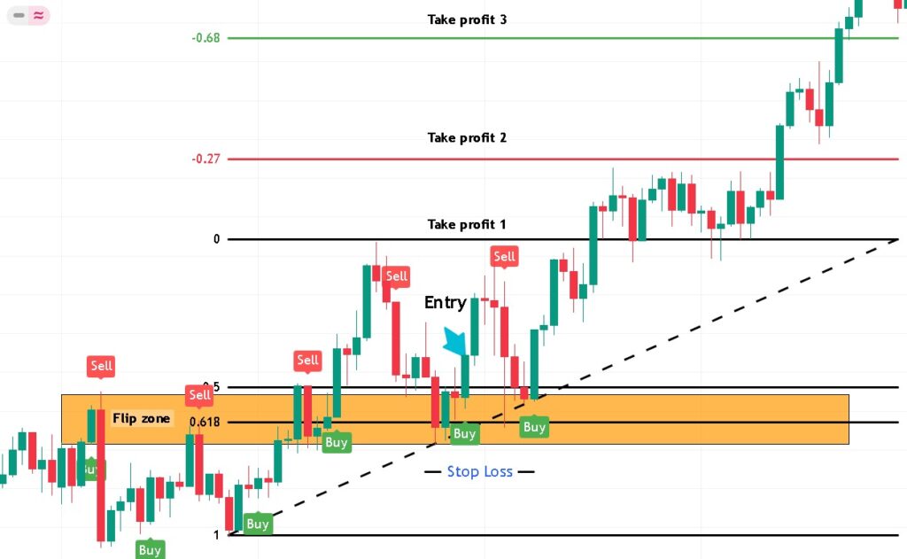 - Check if the retested zone aligns with the Fib 50% or 61.8% level.